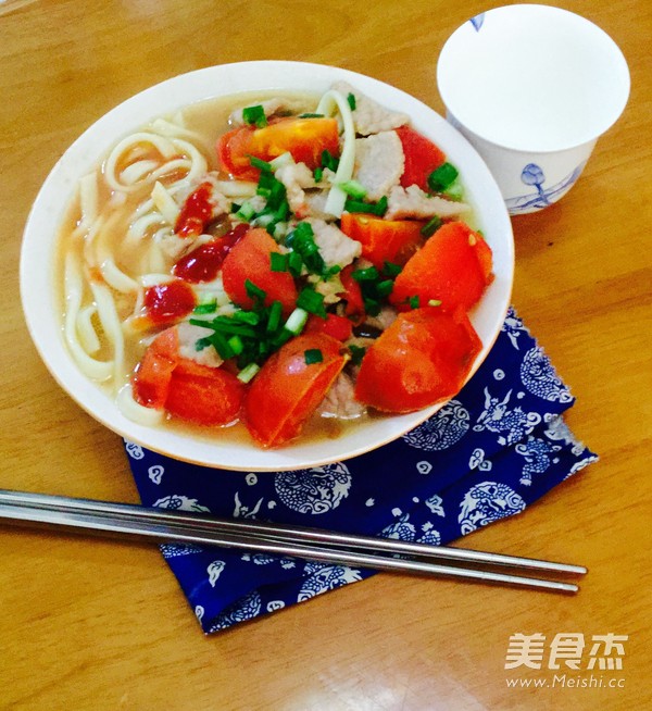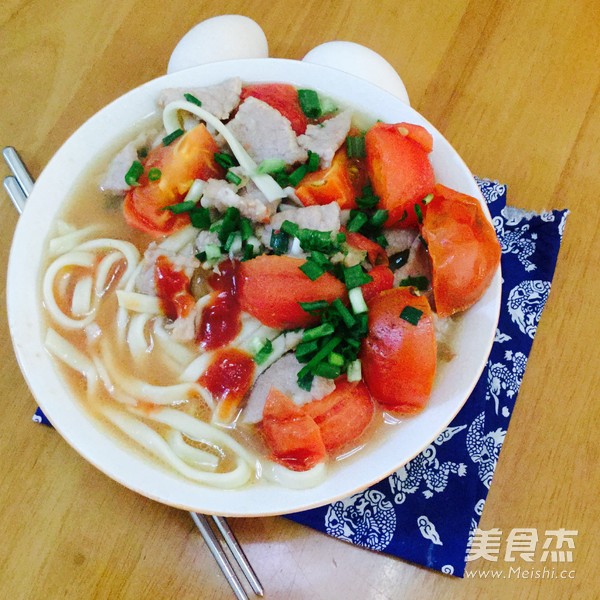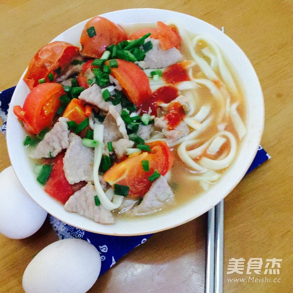 一个人的午餐 主料 面条150克 瘦肉50克 番茄100克 辅料 油10克 盐5克 蚝油3克 香葱3克 姜5克 番茄瘦肉面的做法 1.将面条煮熟,过冷河 2.番茄切块,姜切片,葱切葱花,瘦肉切片,用油盐和蚝油腌10分钟 3.锅里加入水,放入姜片 4.待水烧开后加入面条煮开 5.盛起 6.加入番茄 7.加入瘦肉,煮至瘦肉熟透 8.加入葱花,加入盐调味便可 9.出锅 烹饪技巧 煮面条时加入油盐,可以防止面条粘连
