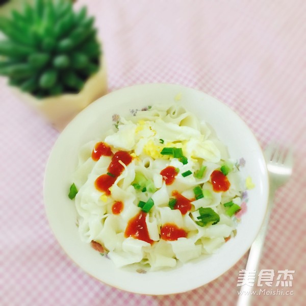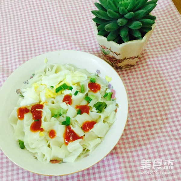 一个人的午餐 主料 面条100克 鸡蛋55克 辅料 油10克 盐6克 番茄酱20克 葱花5克 鸡蛋汤面的做法 1.准备好面条 2.烧开水,煮熟面条 3.捞起用水冲洗一下(过冷河),沥干水分 4.重新烧开水,加入油盐,放入面条 5.打入鸡蛋 6.加入葱花 7.盛出,加入番茄酱便可 烹饪技巧 面条煮熟后过冷河可以使口感更爽
