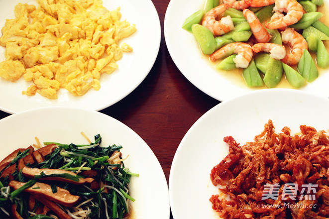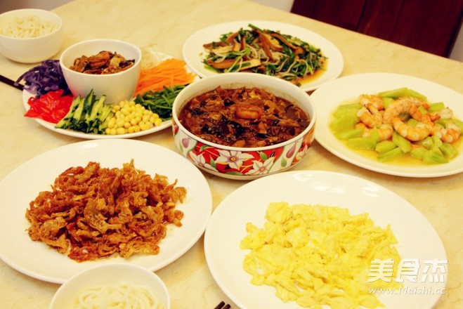 猪肉400克 虾仁200克 香干2块 鸡蛋1枚 干香菇10朵 黄花菜50克 木耳8朵