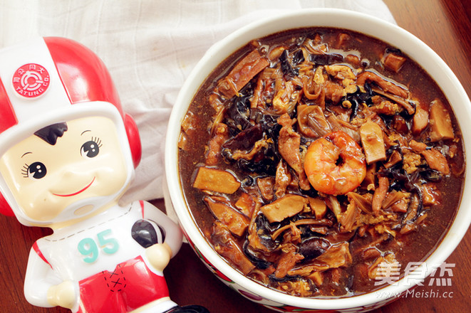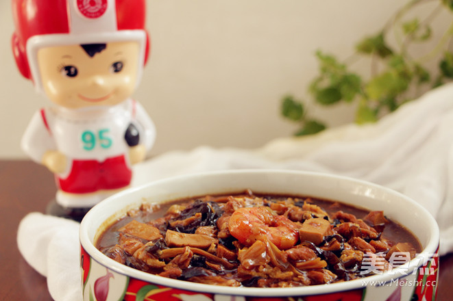 3.大同外锅内倒入油,放葱姜炒香后依次加入猪肉,虾仁等所有食材煸炒,加盐和酱油调味
