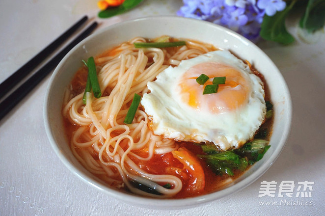 家常早餐面。 主料 西红柿 面条150克 鸡蛋2只 辅料 食盐3克 食用油30克 香葱2克 番茄酱20克 生姜10克 香菜10克 番茄鸡蛋面的做法 1.香菜、番茄、生姜切好备用 2.热锅热油,把番茄片放入 3.将番茄炒至出红汤后,挤入番茄酱炒匀 4.这时兑入适量的清水(如果有高汤更好哟) 5.待番茄汤烧开后,调入少许食用再把面条放入 6.煮至面条快好的时候,加入香菜用筷子拌一下,关火 7.平底锅热油,打入鸡蛋煎至凝固即可 8.面条盛放碗里加上鸡蛋和葱花,一碗快手、简单又开胃的早餐面条就煮好咯 烹饪技巧 无技巧。