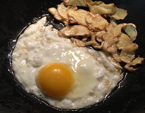 2、姜片微微卷曲后,加入麻油。把姜片拨至一旁,下一颗蛋用空位部分煎荷包蛋至个人喜欢的熟度,煎好后盛起备用。