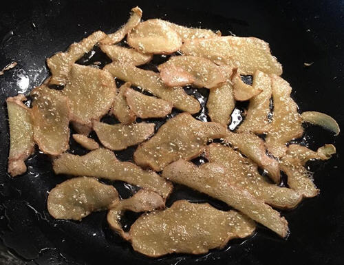 1、由于麻油不宜过热,热锅后先加些许平常使用的食用油,丢入姜片煸至边缘微微卷曲。