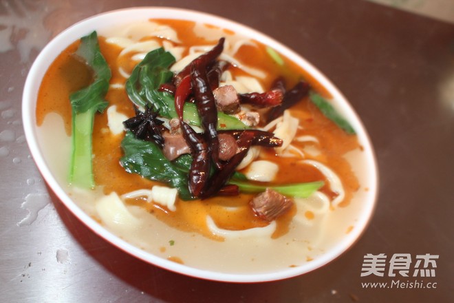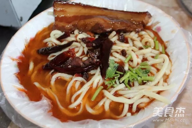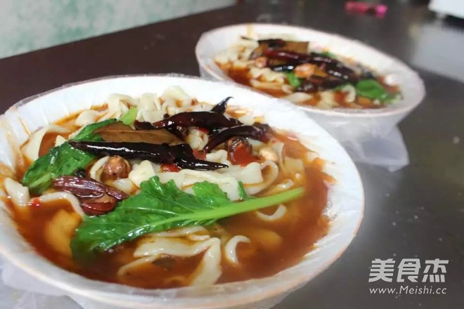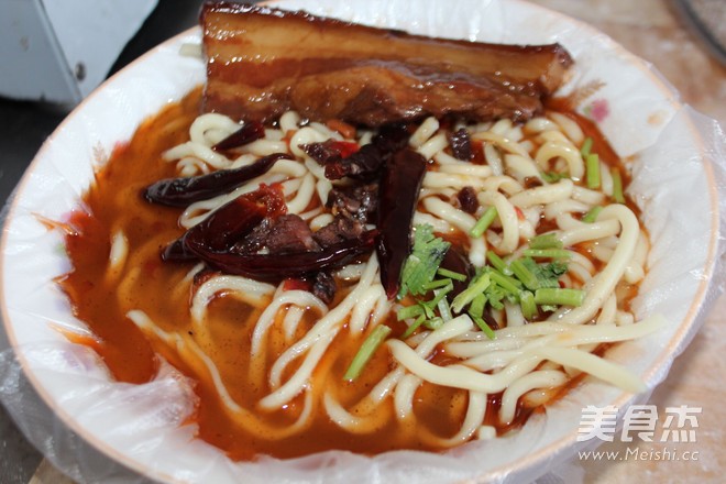 牛肉板面源于安徽太和,面光滑劲道,汤浓味好,咸鲜香辣袭人。料由20多种香料、辣椒牛肉、牛油等经精心熬制而成。淮南的做法是把干红椒用温油炸至半糊(偏糊一点),然后把卤牛肉、卤过牛肉的汤一直倒进辣椒和油里,大火煮开后慢火焖,煮到入味。做好以后最好吃的就是那个辣椒