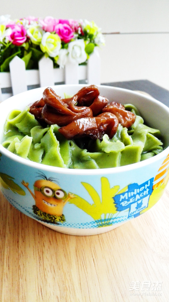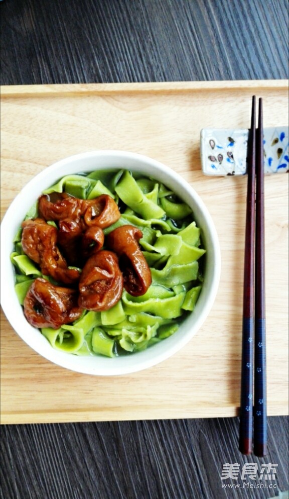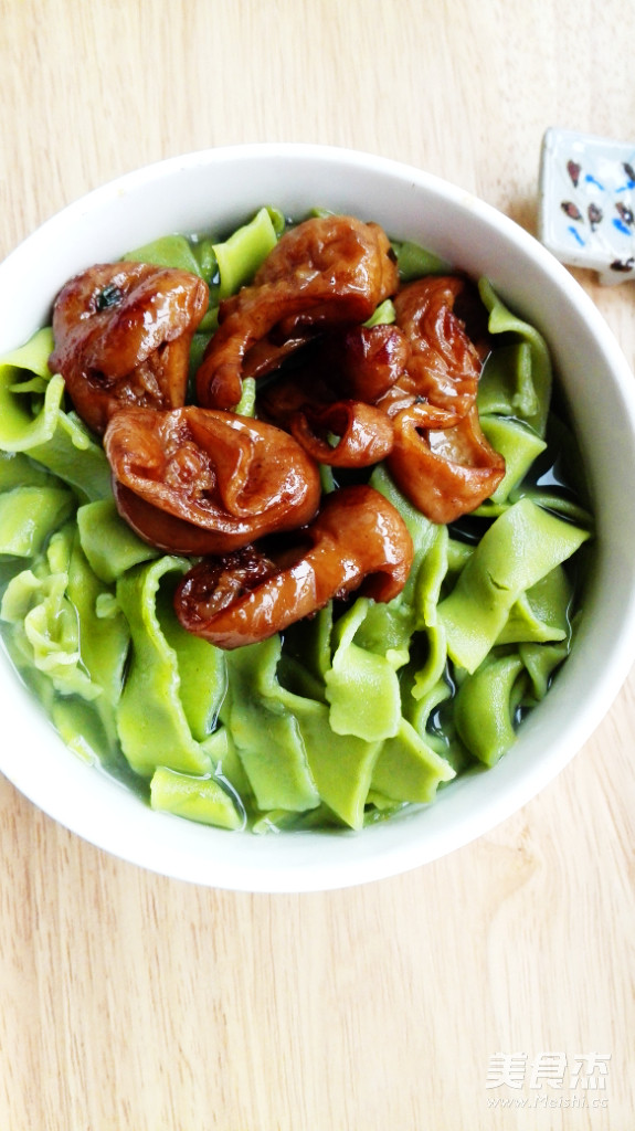 一人食,只有做面条吃最方便啦,用菠菜汁和面,出来的面条翠绿翠绿的,很有食欲哦 主料 菠菜150克 面粉200克 肥肠50克 辅料 清水适量 盐适量 鸡精少许 翡翠肥肠面的做法 1.菠菜用原汁机榨汁 2.面条机内放入面粉,选择筋道面,进水孔放菠菜汁 3.15分钟后出面完成 4.锅内放水,大火烧开 5.放入面条,盖锅盖,大火烧开,放入适量盐 6.煮至面熟后捞出,放入碗中,放入红烧肥肠食用 烹饪技巧 绿色上色最好的就是菠菜汁啦,黄瓜汁做的面条一煮就没颜色喽 点击查看更多:手擀面的做法大全