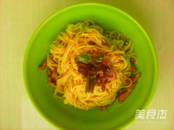 8.煮好后用过凉两次,放入碗中,拌上肉段和葱就可以开吃了