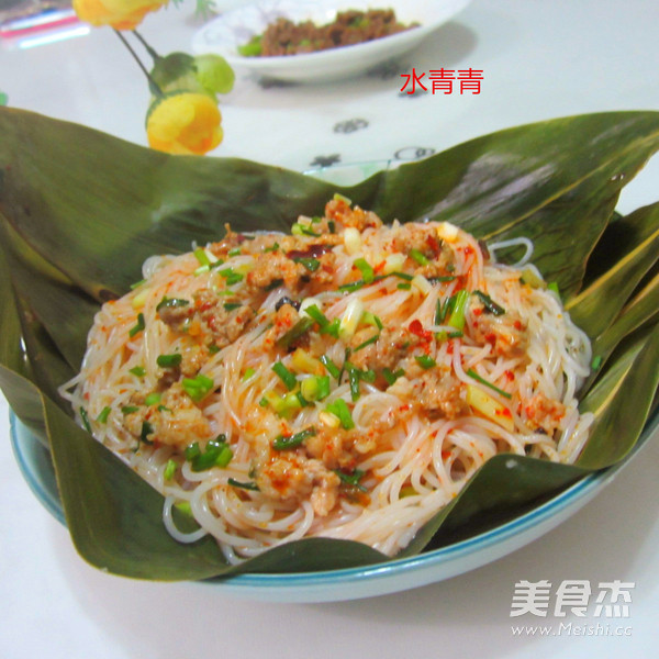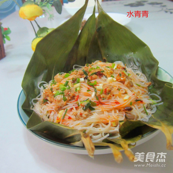 粽香粉丝,试做的。 主料 粉丝150克 肉泥150克 香葱20克 辅料 盐2克 蒸于豉油5克 辣椒油1勺 芝麻油5克 调味鲜2克 粽香粉丝的做法 1.食材 2.粉丝用盐拌匀 3.浇上辣椒油,芝麻油 4.撒上香葱 5.撒上调味鲜,淋上蒸鱼豆油拌匀 6.备粽叶 7.倒进粽叶里 8.放上肉泥,有虾仁放点虾仁更香 9.放进蒸锅蒸5分钟,肉蒸熟了就行。 10.好香的粉丝 烹饪技巧 肉蒸熟了就行。