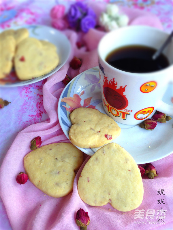 心形是传达爱意的最好方式,玫瑰花瓣代表爱情。心形玫瑰曲奇饼干散发着浓郁的香味,吃起来更加的香酥,搭配玫瑰花更多了一些浪漫。
