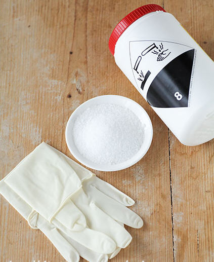 6、碱水中使用的是烘焙碱(如图),即食品级氢氧化钠,属强氧化剂。使用时一定要戴好手套,不要让皮肤直接接触碱水。碱水可以反复使用,没必要一次一弃,暂时不用的烘焙碱和碱水要放到孩子不容易碰到地方,安全起见,用过的碱水还是倒掉吧。