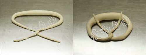 6、将面团绕圈,两头交叉(图6),扭转(图7)后翻上去,使两端搭在中间较粗的面团上,并轻压(图8)。