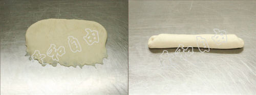 4、将松弛后的面团擀成椭圆形(图2),翻面后压薄底边(图3),自上而下卷起来(图4)。