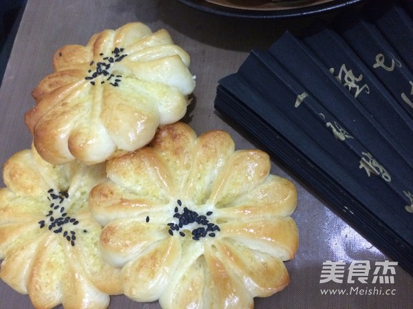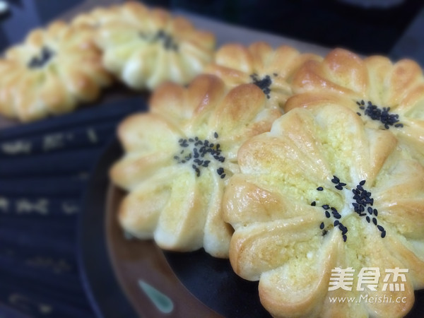 23.取出面包胚,在表面刷上蛋液,这时可以预热烤箱了,在的面包的中心做点装饰,可以放点芝麻或者可可粉之类的装饰在上面