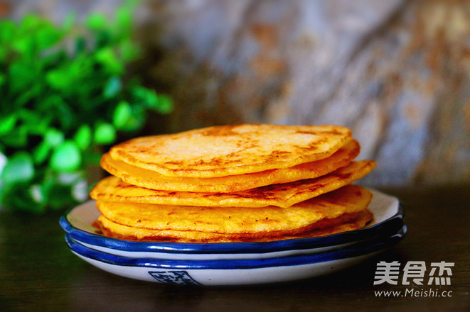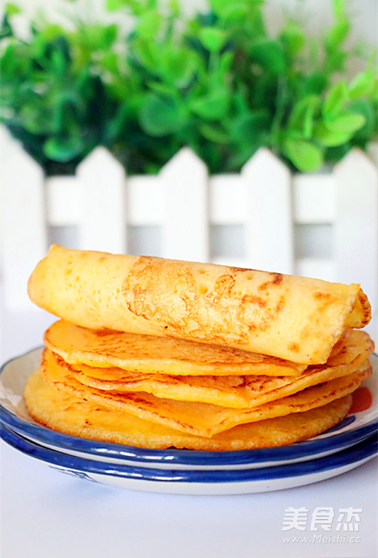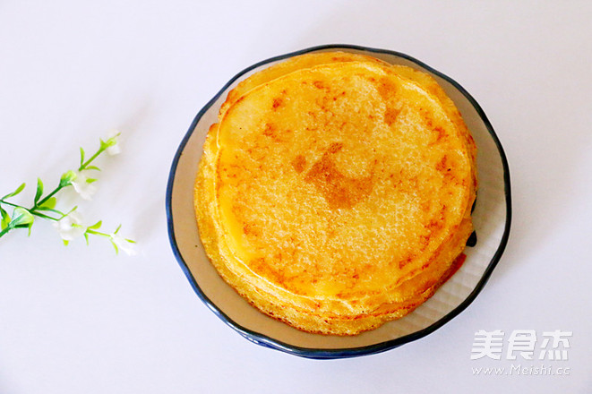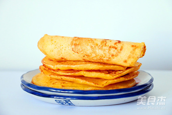 7.待凝固后翻面,至两面金黄即可。如此依次摊好所有的面糊。也可以根据锅底大小,一次多倒入些面糊,烙大些,节省时间