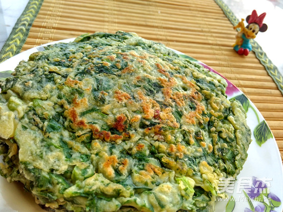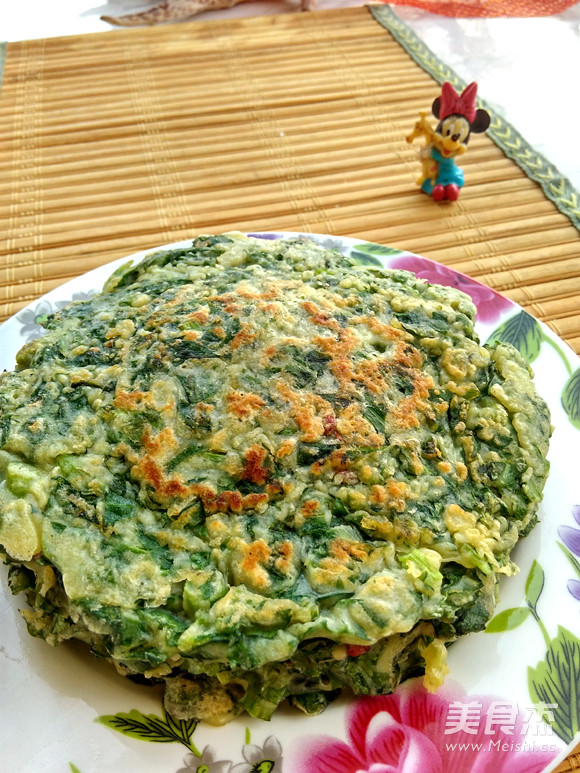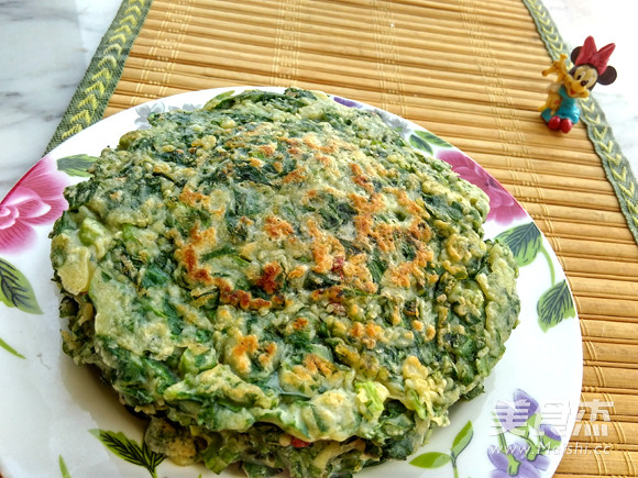 挖上一大勺,摊在锅中,待到表面渐渐凝固,颠勺,翻面,浅浅的金色。粉糊让茼蒿彼此连接,并赋予饼饼弹性的口感,而茼蒿则给饼饼予清香与青翠。。。。