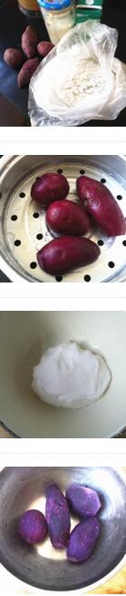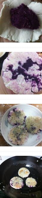 糯米紫薯饼的材料:糯米粉200克,紫薯100克,油,白芝麻,白糖,牛奶,美食网糯米紫薯饼的做法:1. 紫薯洗净,上蒸锅蒸熟,糯米粉倒入碗中,加温水,揉成光滑面团,醒置一会儿2. 蒸熟的紫薯取出过凉水去皮,捣成泥,加白糖,牛奶,捣匀的做法 3. 将醒置好的糯米粉团揉成长条,分小段,揉圆按扁,包入一点紫薯泥,揉圆按扁,成饼状,再两面沾少许水,再均匀沾上白芝麻4. 平底锅倒少许油,放入饼坯,煎至两面微黄熟透即可出锅