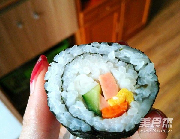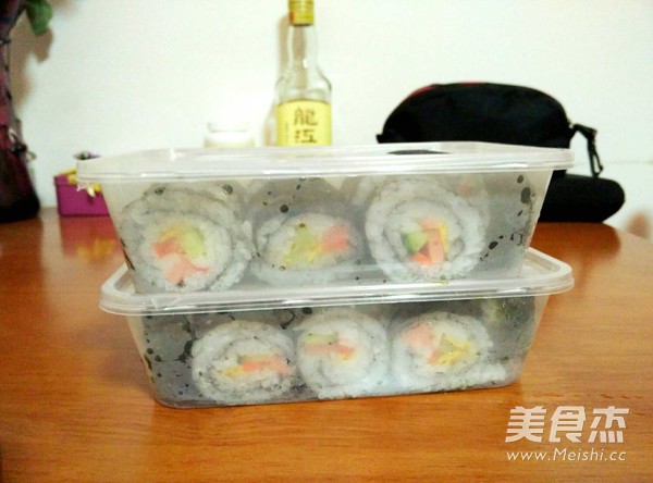 4. 一般中等商场都会有寿司卷和寿司海涛卖。这个不贵8元10片好吃。拿一张铺好。竖着放。