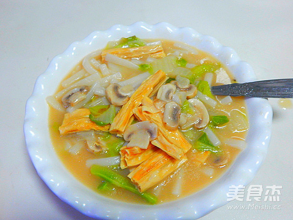 新年第三天吃的一道快捷早餐是为了吃饱点,一早出门玩不会早早饿肚子 主料 白菜100克 腐竹80克 年糕500克 口蘑30克 辅料 水2碗 浓汤宝1个 盐4克 生抽3克 白菜腐竹煮年糕的做法 1.白菜清洗干净切好 2.口蘑切片 3.锅里加油倒入白菜炒 4.大火炒软 5.然后加入2碗水 6.煮开后加入一个浓汤宝 7.大火炖8分钟 8.然后加入年糕 9.炒匀后加入口蘑 10.在大火煮五分钟 11.然后加入盐及腐竹 12.加一点生抽 13.煮至年糕熟即可关火 14.煮好装盘 烹饪技巧 年糕加入的时候一定要多搅拌不然容易沾锅