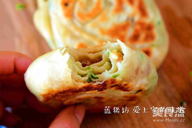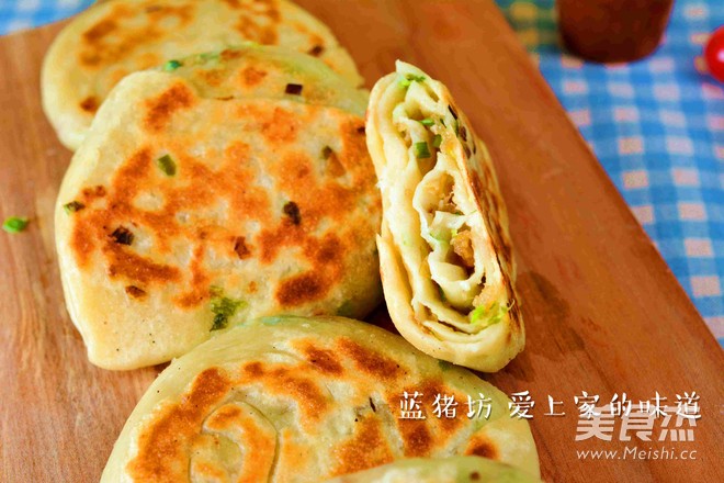 4.平底锅烧热,下入饼胚,小火烤2-3分钟,然后翻面再烤2-3分钟,再重复1次,到油渣饼熟透.