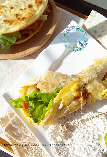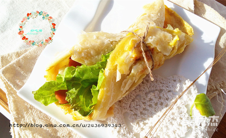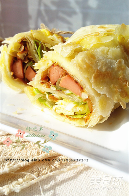 自己做鸡蛋灌饼,夹上三片生菜叶,一根火腿肠,满满的鸡蛋灌入饼中,完全秒杀外面的灌饼~
