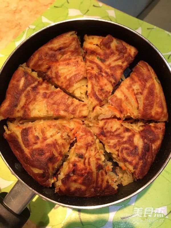 自制西班牙土豆饼 外酥内嫩好好吃Aya! 主料 土豆450克 小洋葱50克 胡萝卜80克 香葱50克 鸡蛋3个 小麦粉30克 辅料 橄榄油3勺 鸡精2勺 盐3勺 土豆饼的做法 1.将土豆 胡萝卜 洋葱 洗净削皮切成丝 再把葱切成葱末 2.将土豆丝 胡萝卜丝 洋葱丝 葱末放入碗中 加入小麦粉 盐 鸡精 黑胡椒 鸡蛋搅拌均匀 3.将平底锅倒入橄榄油 放入拌好的土豆丝 用筷子拔开成均匀地圆饼壮 用中火煎制 一面煎黄后翻过来煎 煎到金黄色 吃的时候用刀分割成小块即可