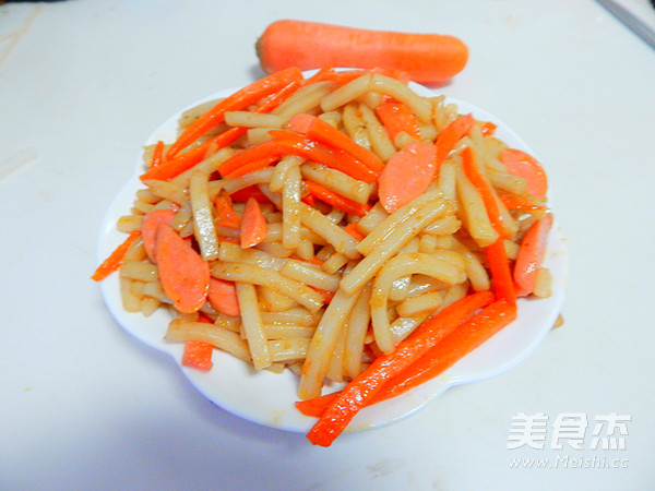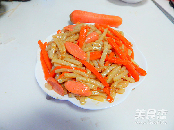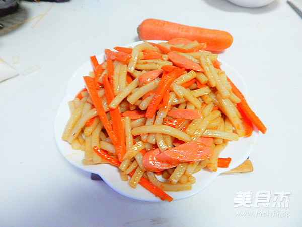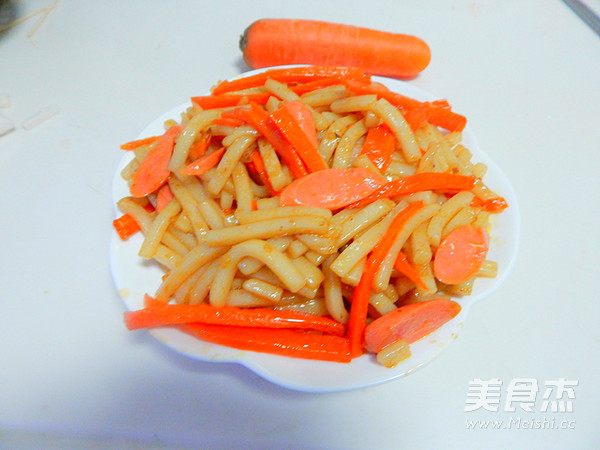 晚上孩子爸又不回来吃饭,就跟孩子炒个年糕吃吃 主料 年糕300克 胡萝卜150克 火腿肠2根 辅料 盐4克 鸡精2克 生抽5克 水半碗 胡萝卜火腿肠炒年糕的做法 1.年糕切开 2.胡萝卜及火腿肠 3.锅里加入油加入胡萝卜炒 4.炒几分钟 5.加入年糕炒 6.快速炒匀 7.然后加入生抽 8.炒匀后加入盐 9.然后加一点水和火腿肠不停的翻炒 10.在快火翻炒均匀 11.炒至年糕入味加入鸡精 12.炒好装盘 烹饪技巧 炒年糕的时一定要快火炒,加一点水更好炒