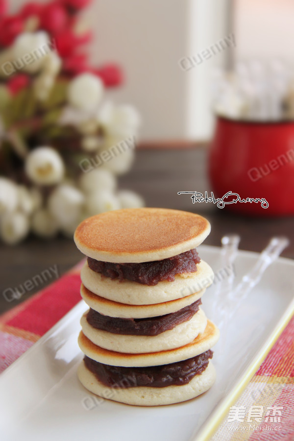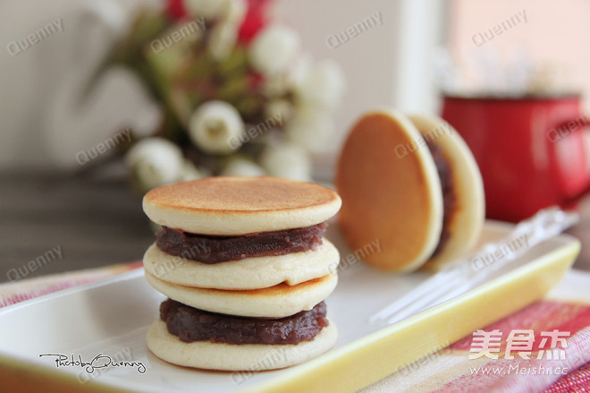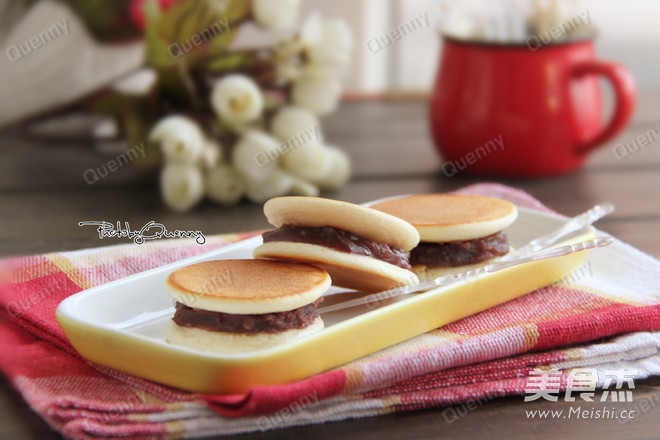 10.出锅后取两片松饼,中间加入适量豆沙馅即可
