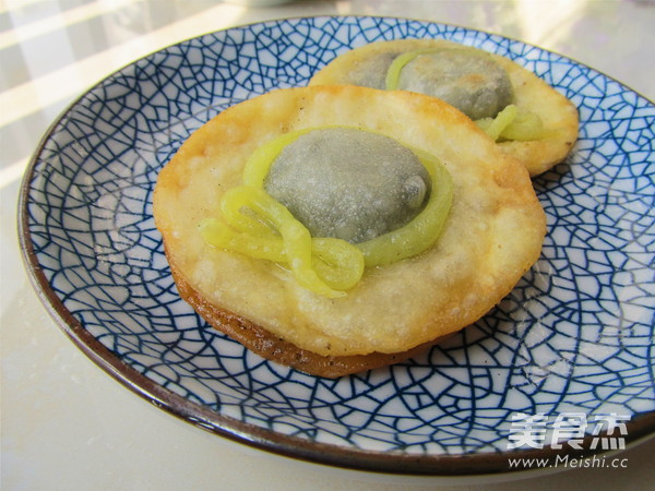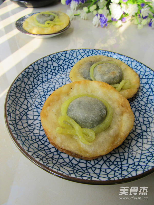 非常可爱的草帽饼。 主料 饺子皮6张 黑芝麻馅20克 辅料 面粉5克 菠菜汁适量 草帽饼的做法 1.准备食材:饺子皮,黑芝麻馅 2.将芝麻馅分成小份、搓圆 3.芝麻馅放在饺子皮正中间,在饺子皮四周抹上水 4.盖上另一张饺子皮,压实 5.将四周修剪一下 6.面粉中加入少许菠菜汁,揉成绿色的面团。(也可以用修剪下来的饺子皮边角料 加一点点抹茶粉揉成团) 7.取一小块绿色面团,搓成细长条 8.草帽上粘一点点水,把搓好的绿色面条围在上面,做出一个蝴蝶结就可以了 9.做好的草帽饼生坯 10.锅中加油,烧至8成热时,放入草帽饼生坯 11.炸制金黄变脆,捞出
