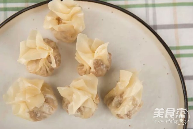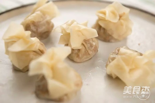 5.将拌好的糯米馅包入馄饨皮内收口,一个烧卖的样子就做好了。