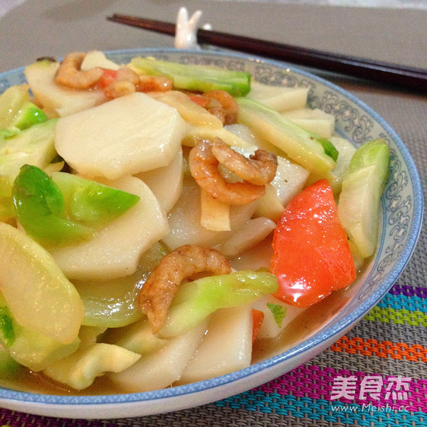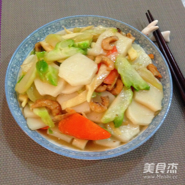 虾米晒干易保存,在吃时只要取出稍微浸泡下就可以做菜,那一个鲜香 主料 年糕150克 虾米30克 娃娃菜100克 茭白半根 胡萝卜1节 辅料 料酒1小勺 盐2克 鸡精2克 虾米炒年糕的做法 1.材料备好,菜切片,虾米用少许料酒浸泡一会,年糕清洗一下 2.锅里放一点肥肉和一点植物油熬出的油香 3.接着下虾米煸炒一会儿 4.下蔬菜翻炒一会淋料酒再下年糕炒一会 5.加适量水煮开好让年糕变软 6.出锅前加点鸡精调味 烹饪技巧 炒年糕不仅方便,而且食材可以自行搭配