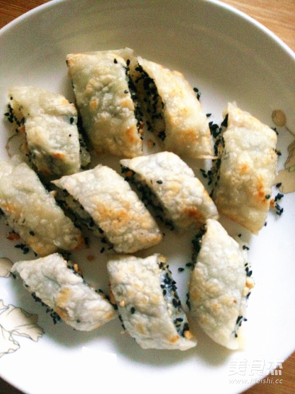 4.4.烤麻糍:不黏锅烧热,撒入少许食用油(一点点就可以了),然后放入冻得硬邦邦的麻糍改小火慢慢烤。等到颜色变得透明就可以翻面了,当然没有一定要什么事后翻面的,多翻几次也没关系哦。直到你觉得表皮颜色是你喜欢的就可以均匀撒上馅料,等你觉得另一面也可以了就熄火。