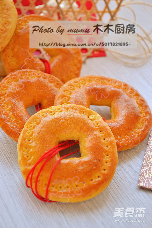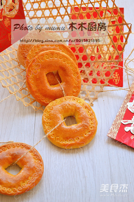 主料 面粉600克 南瓜100克 辅料 水适量 酵母5克 蛋液适量 金钱饼的做法 1.南瓜去皮去瓤,切成小块入搅拌机打成南瓜汁,用南瓜汁和好面,放置温暖处发酵至原来的2倍大 2.取出一剂子,擀成圆形,用刀子在圆中心掏出一四方形面团 3.用吸管在圆旁边压出小圆形,再用牙签在小圆中心戳个印子 4.饼胚做好,放入加热过的电饼铛中定型3分钟 5.将定型好的饼胚刷上蛋液,放入烤箱170度10分钟即可 烹饪技巧 用吸管压制饼胚的过程比较繁琐,需要一些耐心,其他步骤和做馒头的过程相同