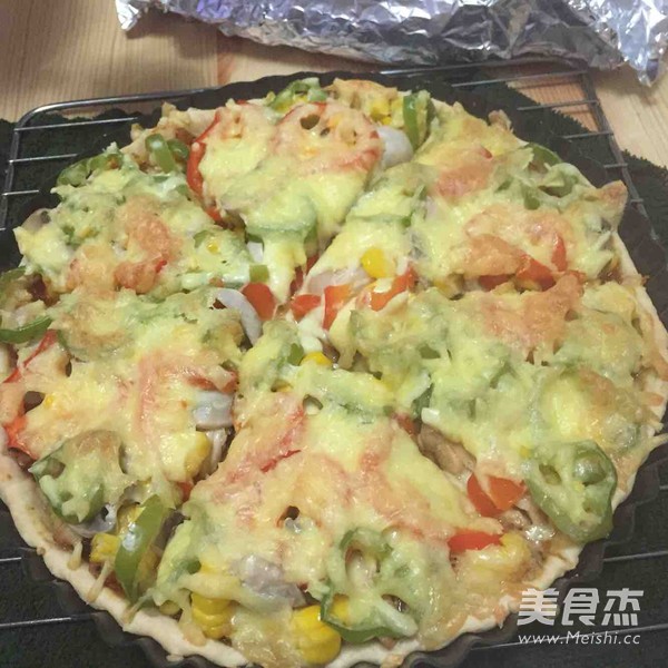 马苏里拉150克 熟玉米粒100克 红彩椒50克 口蘑200克 尖椒50克 马苏里拉奶酪150克 西红柿1个 圆葱小半个 披萨草1克 罗勒1克 黑胡椒3克 淀粉1汤匙 虾仁100克 白胡椒粉1克 盐2克 糖5克