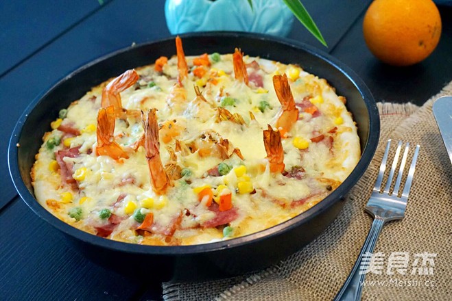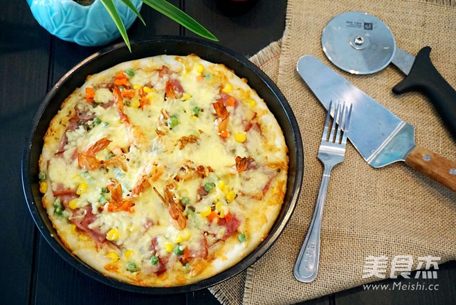 8.先放培根和鲜虾,上面铺蔬菜丁,撒少许披萨草。