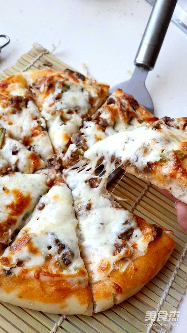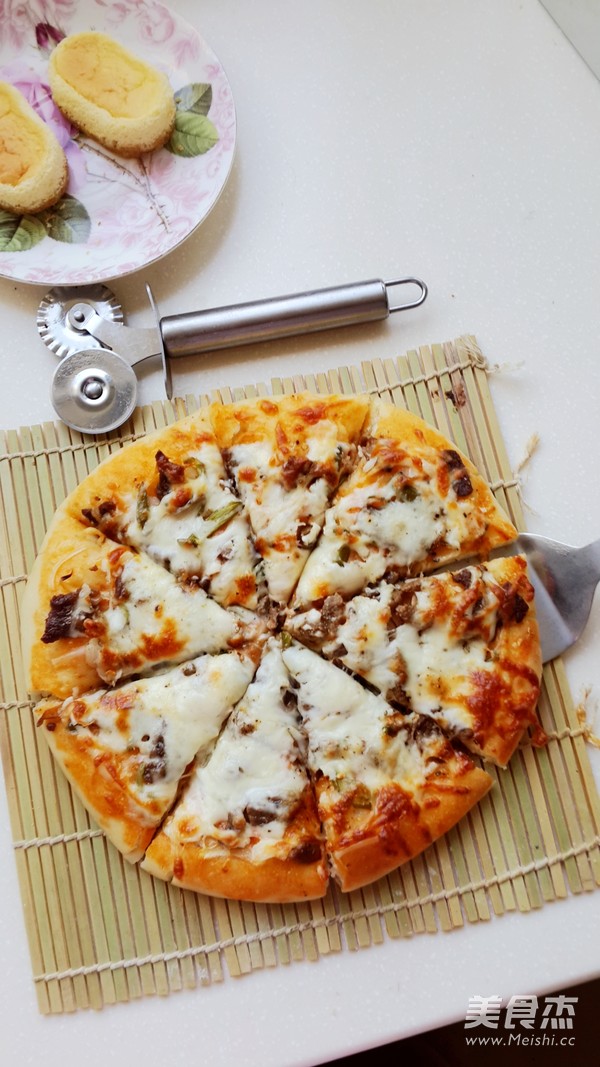 牛肉葱香比萨 主料 披萨饼坯150克 洋葱1个 番茄1个 芝士200克 辅料 盐1茶匙 番茄酱1汤匙 黑胡椒1茶匙 白糖2茶匙 橄榄油2汤匙 牛肉葱香比萨的做法 1.所有食材洗净切碎 2.锅中加入适量的有炒香葱花 3.加入番茄继续翻炒,加入调味料炒均匀凉凉备用 4.将比萨饼皮解冻 5.抹上自制番茄酱料 6.表面洒上各种食材最后杀伤一层芝士 7.烤箱预热190度烘烤15分钟左右 烹饪技巧 牛肉葱香比萨
