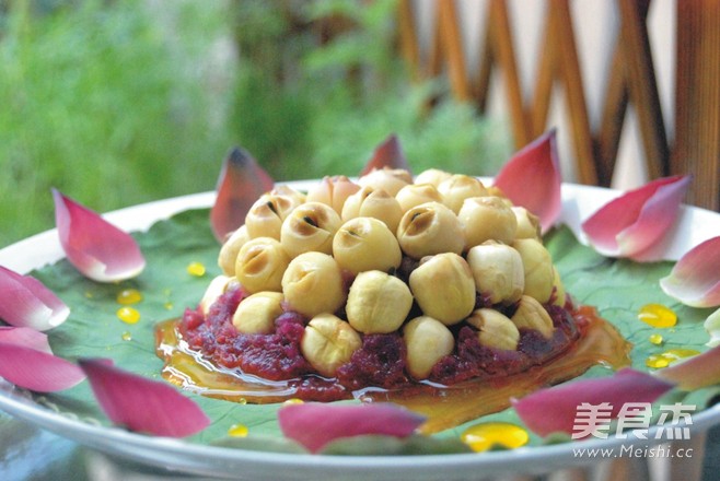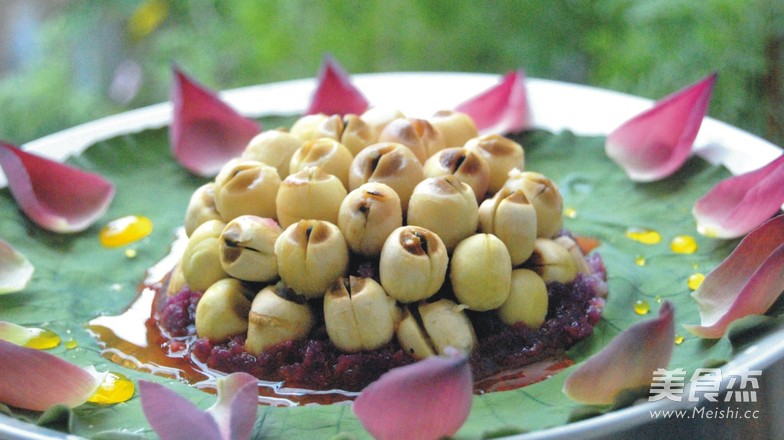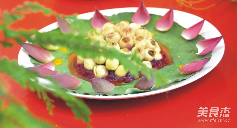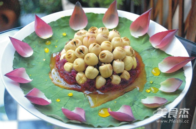 6.出锅后反扣在已铺上荷叶的盘中。锅内倒入少许鲜橙汁加少许糖勾芡淋在莲子上,边上用荷花瓣点缀就OK