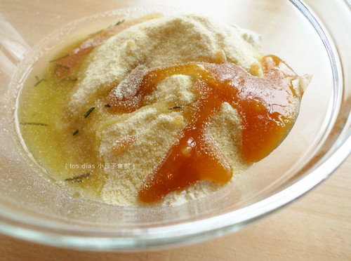 2、搅拌盆内放入粉类、蜂蜜、盐、步骤1的橄榄油。