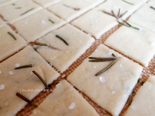 这道迷迭香海盐小脆饼除了加入新鲜迷迭香外,利用浸泡过迷迭香的橄榄油混合入面团里,搭配粗海盐提味,优雅又神祕的香气,口感酥脆,好适合嘴馋的每一刻。