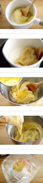 4.将面团放入钢盆中,分次加入鸡蛋液,每次都要完全搅匀后再加,直到搅拌成为有光泽的面糊,并且能够挂在木铲上形成倒三角状态,就可以了,将制作好的泡芙面糊装入保鲜袋中,在不粘烤盘(或在烤盘中铺油纸)上挤成直径大约4cm左右的圆形,中间要保留出足够的距离,叉子沾少许水,将面糊表面的尖顶轻轻按下去