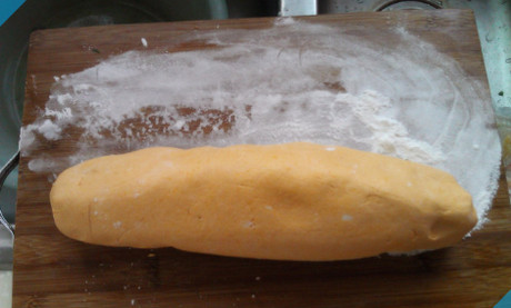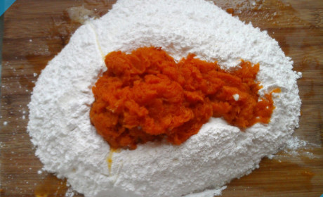 2、蒸熟后将软的肉全部挖出放入白面中,根据个人口味,可加入糖或牛奶后进行揉面。