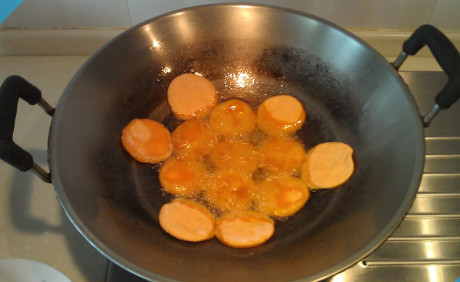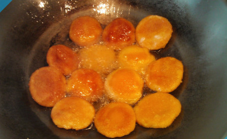 7、等油温差不多八九十度的时候,放入南瓜饼进行煎。