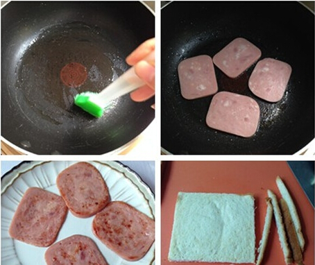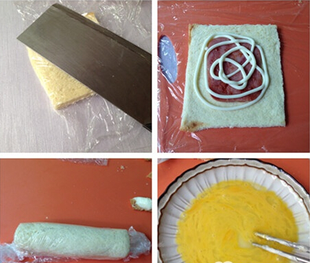 金色吐司卷的材料:鸡蛋1个,火腿60g,白土司4片,油适量,沙拉酱适量 金色吐司卷的做法: 1.切四片火腿不要太厚。在油锅里倒入少许油,用刷子刷一下油,放入火腿,小火慢煎出锅 2.切去面包片边缘,用保鲜膜包起来,然后用刀背按压。反复压多几次,尽量压薄,然后将火腿铺在面包片上,然后抹上沙拉酱,然后将面包片卷起,再用保鲜膜稍微定型两分钟 3.将鸡蛋打散,然后将刚才卷好的面包片放入蛋液中,让其均匀的裹上蛋液 4.坐锅少许油少许油,放入吐司卷,小火慢煎,注意把封口的一面朝下。然后翻面煎至金黄色出锅,将吐司卷切成小块给宝宝吃
