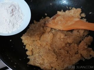 8、当变成十分稠厚、干且硬的状态时,加入熟面粉,翻炒均匀并关火,馅就炒好了