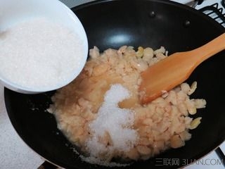 6、将煮好的芸豆倒入锅里,加入细砂糖,开始翻炒