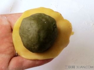 14、手掌上沾少许面粉,取一个饼皮面团,在手掌上压扁,把馅料放在面团中间