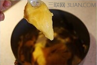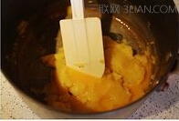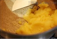 3、然后开小火,继续边加热边翻拌,蒸发掉多余水份,当锅底出现一层薄膜时关火。
