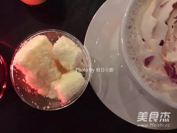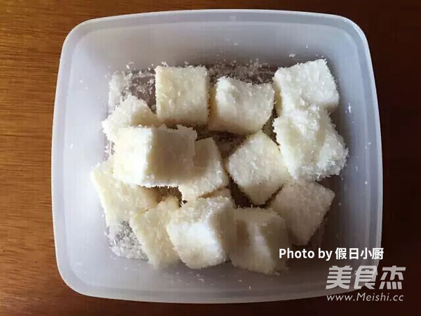 6.待其放凉后放入冰箱冷藏1小时,拿出来切成方格子,滚上椰蓉即可