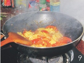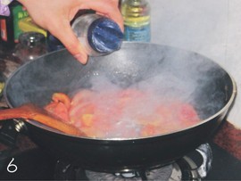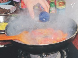 5、锅内再倒少许油,放入几粒蒜米后把番茄倒入锅内。