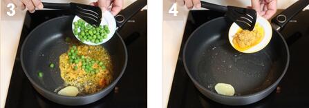 2. 在油镬中高火加热适量油。加入姜,蟹黄和青豆翻炒。加入调味料搅匀。