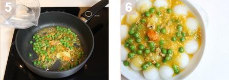 蟹黃冬瓜球的材料:冬瓜400克,蟹黄和蟹肉的混合物2汤匙,水150mL,青豆50克,姜10克,中式料酒1汤匙,盐1/4茶匙,糖1/4茶匙,白胡椒粉