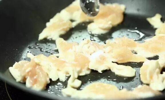将鸡胸肉切成片状,倒入锅中加半勺盐和胡椒粉爆炒1分钟至7-8成熟就可以出锅了。